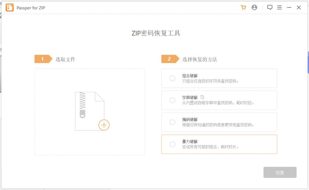 Passper forRAR/ZIP/Excel/word是一款简单好用的快速rar/zip/Excel/word密码恢复工具,如果您忘记了您的压缩文件解压密码或者是下载了根本不知道密码,没关系,本工具帮助你轻松搞定问题,您只需要添加您的文件,选择一个合适的恢复方法,恢复方法是根据实际情况来选择的,如组合破解是只组合你选择的字符来查找密码。字典破解是能够从内置或自制字典中查找密码,耗时较短。Ecxcel表格密码和word密码破解时间有点长,但是一定可以破解的,测试压缩包效率最快>Excel=word