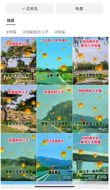 大家好,今天给大家带来的项目是儿女祝福视频,2023年一定要抓住银发经济新风口,最近这种视频在视频号悄悄火起来了,就是这种儿女的祝福视频,视频的主题就是为了祝福自己的儿女,看一下这个账号,条条视频都有大几千上万的点赞量,最近我也是收到了父母转发给我的这类视频,才意识到他是一个风口。