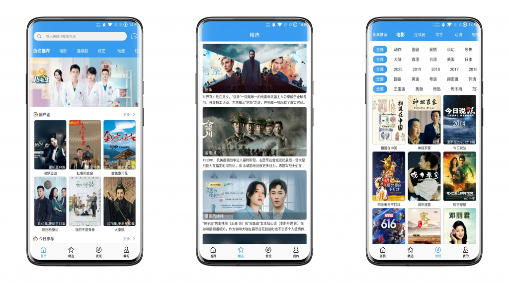 一款影视app。每部影片都有多条线路。最大的特点是对影片的分类相当详细,除了基本的按照国家、类型、年份分类以外,还可以安装语言分类,有国语、英语、粤语、闽南语、韩语、法语等等,还有按明星分类